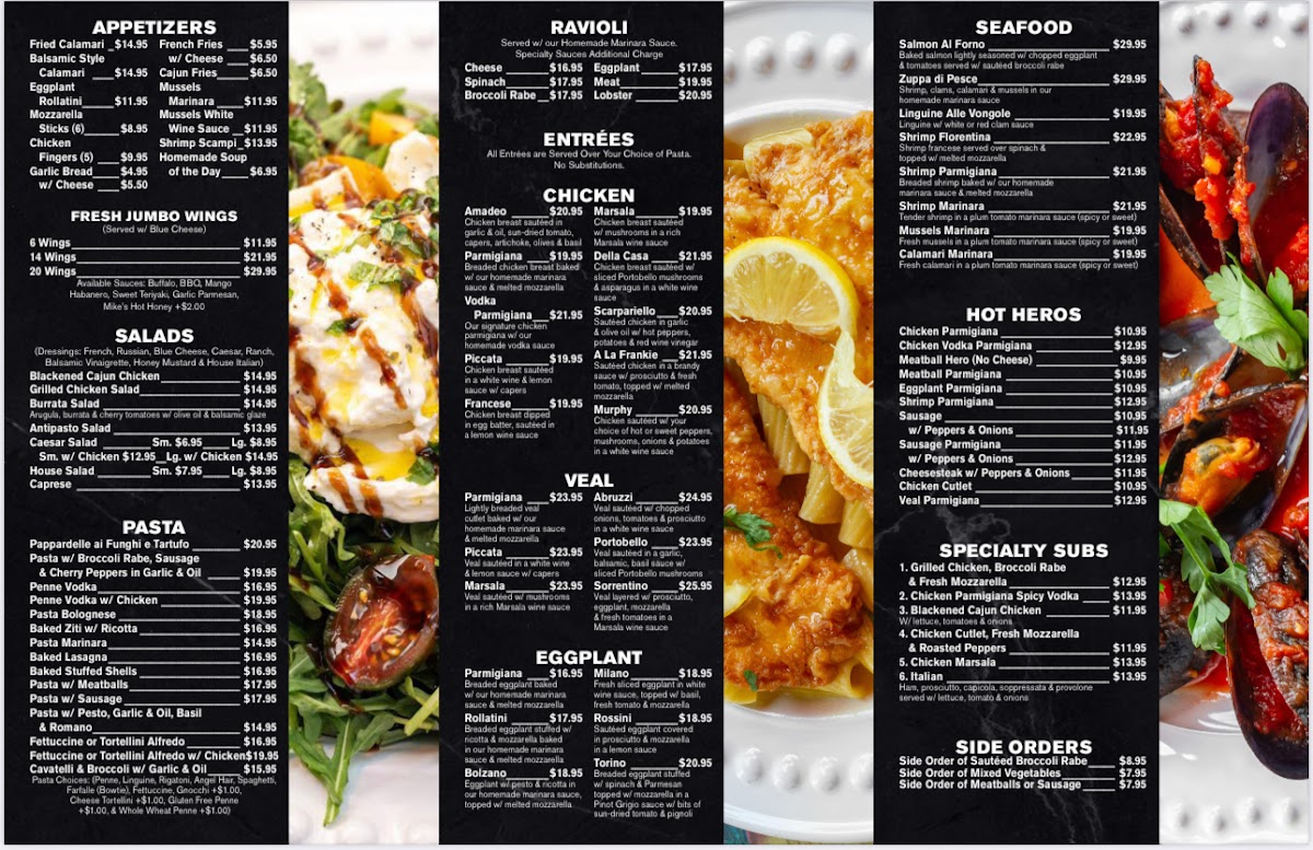 Meat lovers can indulge in the Pollo (Chicken) dishes such as Chicken Marsala or the flavorful Amadeo Chicken Special. For seafood fans, the Pesci (Seafood) section offers mouthwatering dishes like Shrimp Scampi and Frutta Di Mare Fra Diavolo.